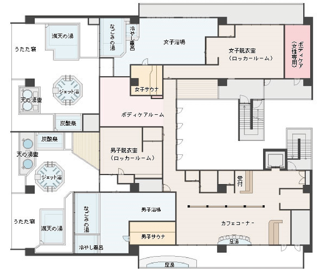 多彩な浴槽やリラックススペースで、一日中楽しめる施設です。