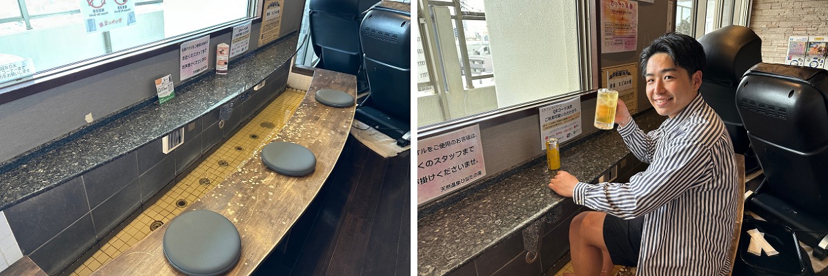 湯上がりには、カフェコーナーの休憩スペースで「ブルポ(ポカリスエット+レッドブルエナジードリンク)」をいただきました。ひなたの湯の面白いところは、湯上り後にも「足湯」が楽しめるところ。タオルも追加料金無しで貸出してくれるのです。