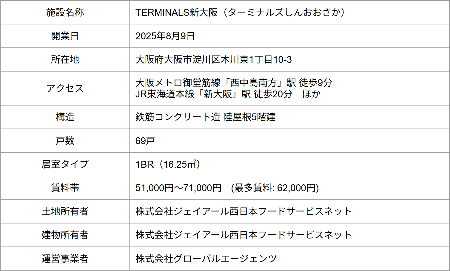 TERMINALS新大阪は、JR西日本グループである株式会社ジェイアール西日本フードサービスネットが長年保有してきた社員寮を有効活用方法するため、JR西日本の業務提携先であるグローバルエージェンツとの取り組み第三段として、ソーシャルアパートメント事業が採用され、開業に至りました。