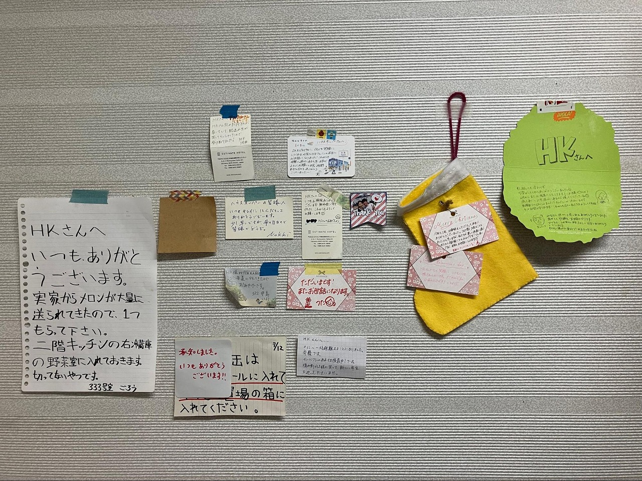 ▲入居者さんからハウスキーパーさん宛に送られたメッセージの数々。些細なメモでも何年も大切に飾られています。