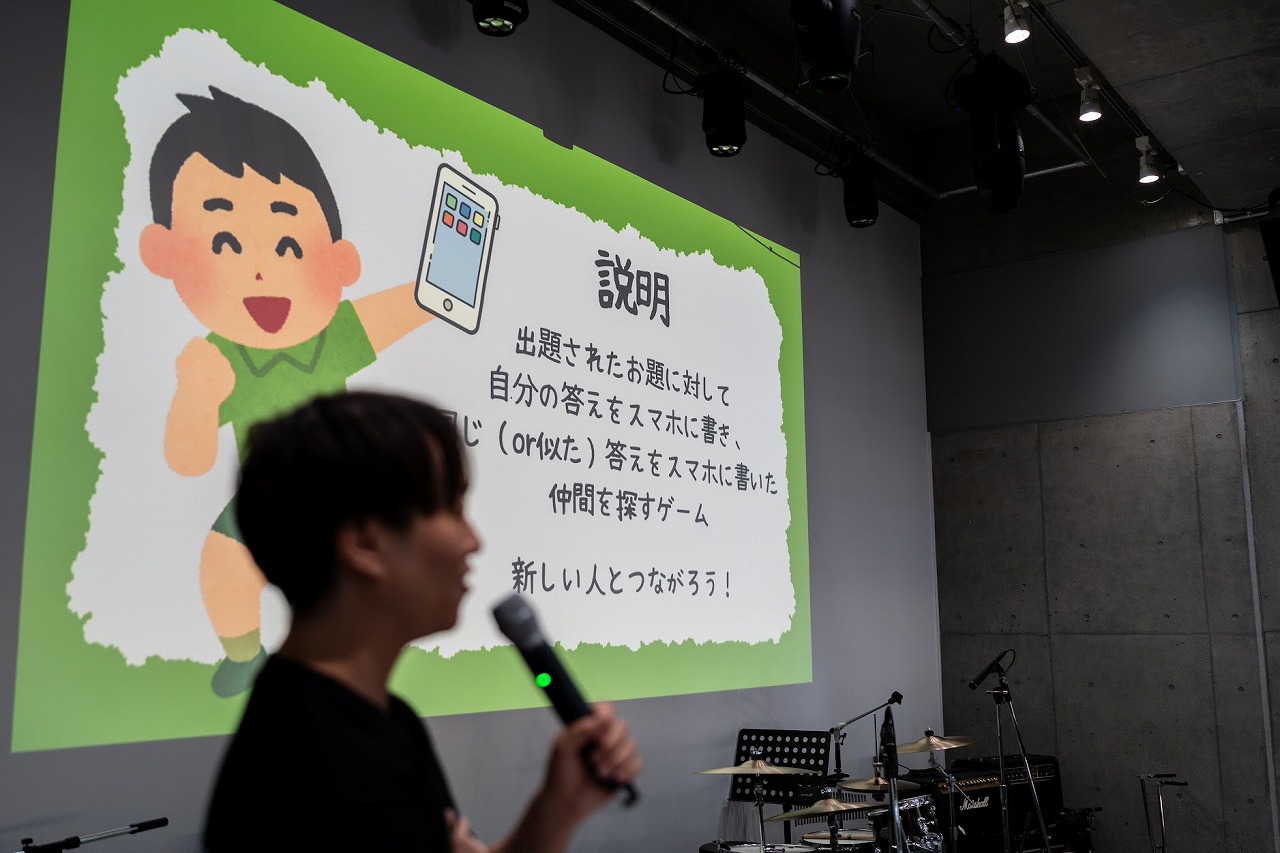 出題されたお題に各自が答えを考え、同じ答えを考えた「仲間」を大衆から探し集める―というとても単純なゲーム。それでも、意外と答えが分かれていたり、なかなか「仲間」が見つからなかったりと、制限時間内は会場中でお互いに声を掛け合う入居者さんでいっぱいになりました!