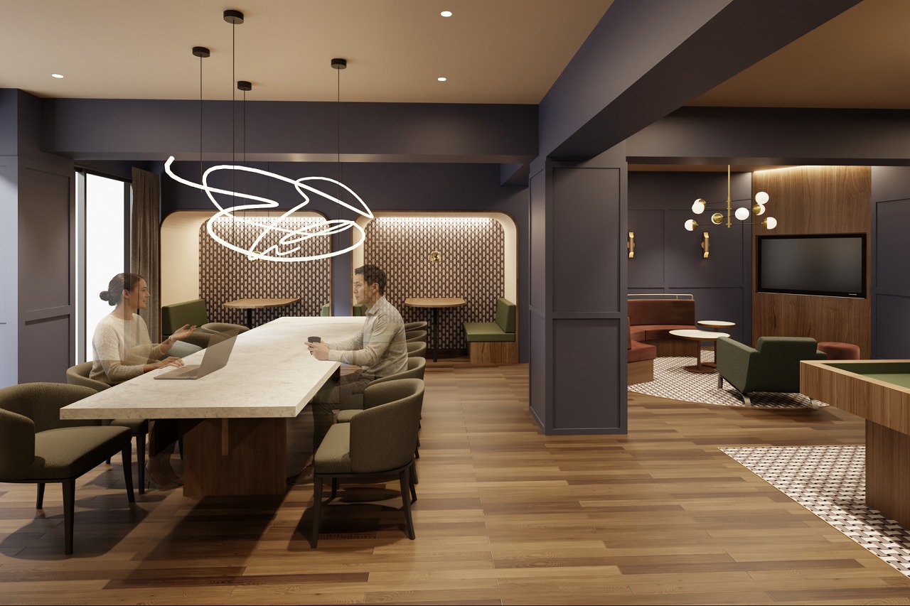 ネイバーズ羽田には、ラウンジと多機能ワーキングラウンジと2つの共用空間を用意しています。空港の会員制ラウンジを想起させるラグジュアリーで落ち着いたトーンのデザインが特徴です。