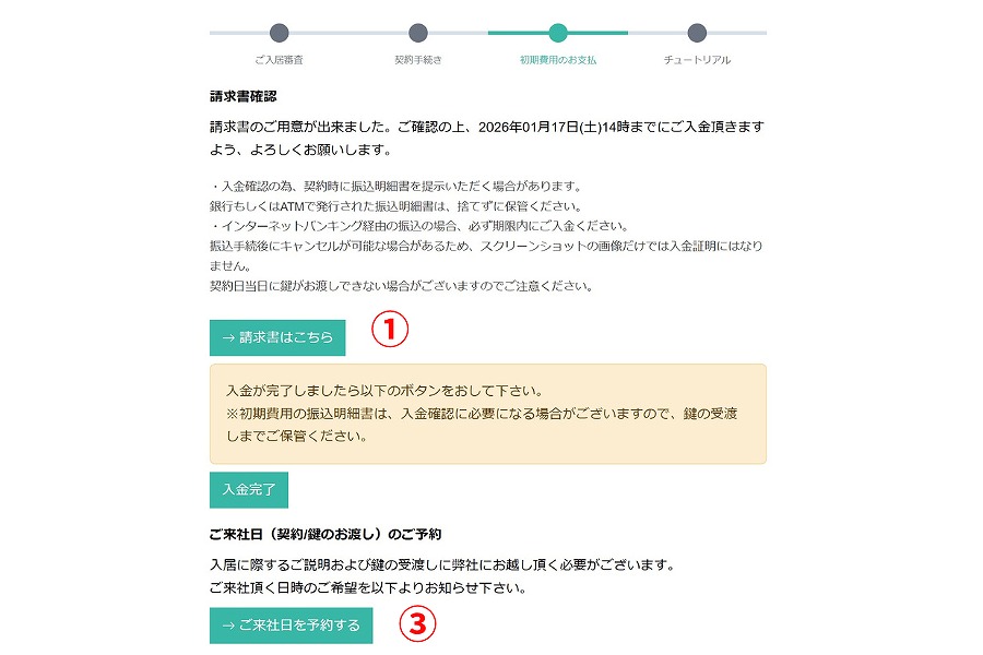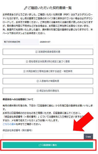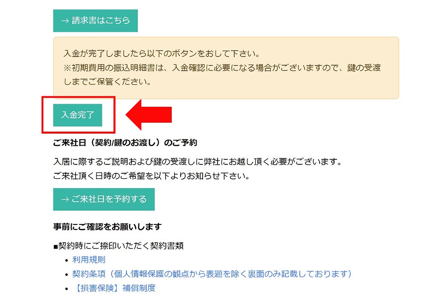 初期費用の入金が完了したら、「入金完了」ボタンをクリックするとオンライン契約ページへ進みます。(入金完了後でないと契約画面は表示されません)