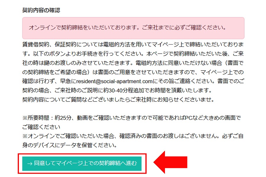 「オンラインで契約しますか?」という確認画面が表示されるので、内容を確認のうえ「同意してマイページ上での契約締結へ進む」を選択してください。