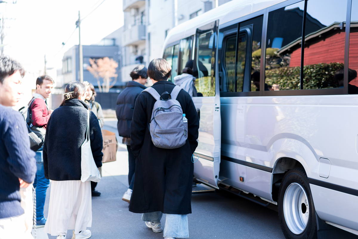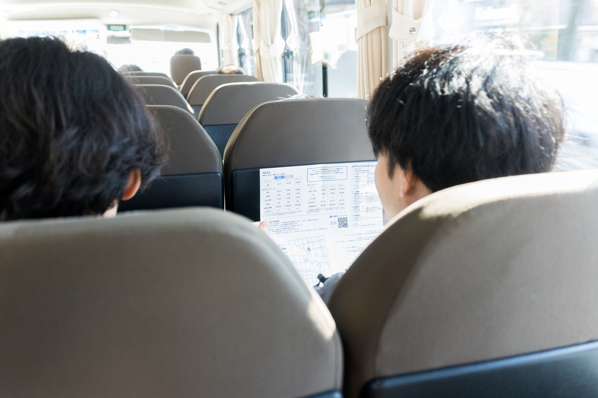 その後は、いよいよ工事中の物件へ。大人数での移動になるので、バス移動になることも。初回の内覧会では最大45名が乗れる大型バスで移動。まるで修学旅行のような雰囲気に、参加者の皆さんも自分は何をしに来たんだっけ?と非日常な内覧会を楽しんで頂いていました。