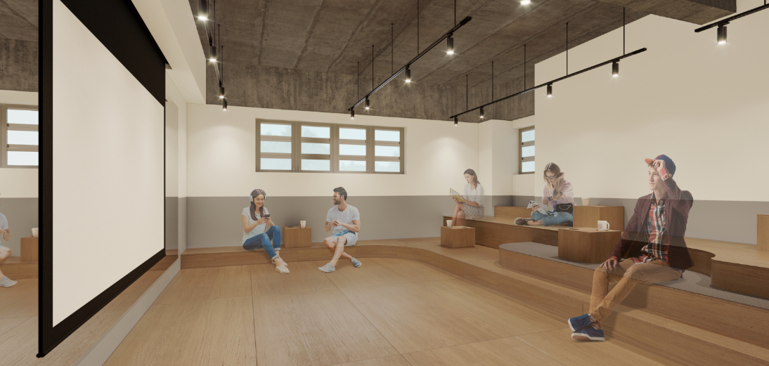 ひな壇状に配置された座席に腰かけて高品質プロジェクターで映される映画を楽しんだり、ヨガやストレッチなど仕事で疲れた体をリラックス。