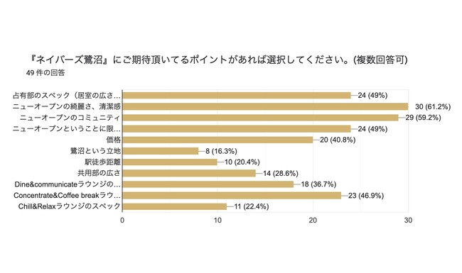 また『ネイバーズ鷺沼への期待するポイント(複数回答可)』では、「ニューオープンのコミュニティ」「ニューオープンということに限らず、交流が持てること・人間関係の広がり」との回答が物件の清潔感に次いで上位を占めるなど、コロナ禍においても人との交流に期待を寄せる声を多く頂きました。