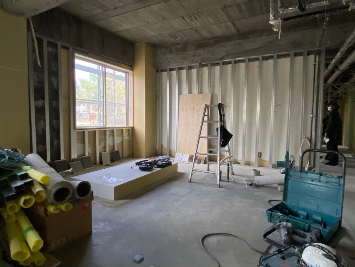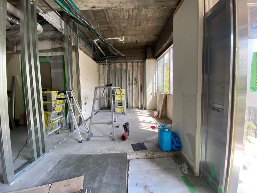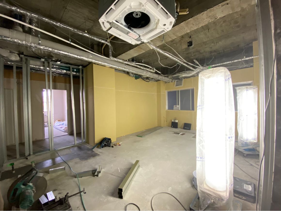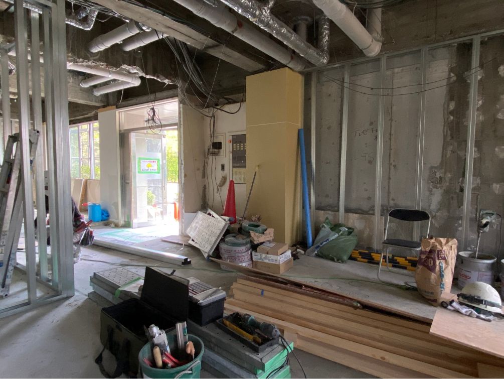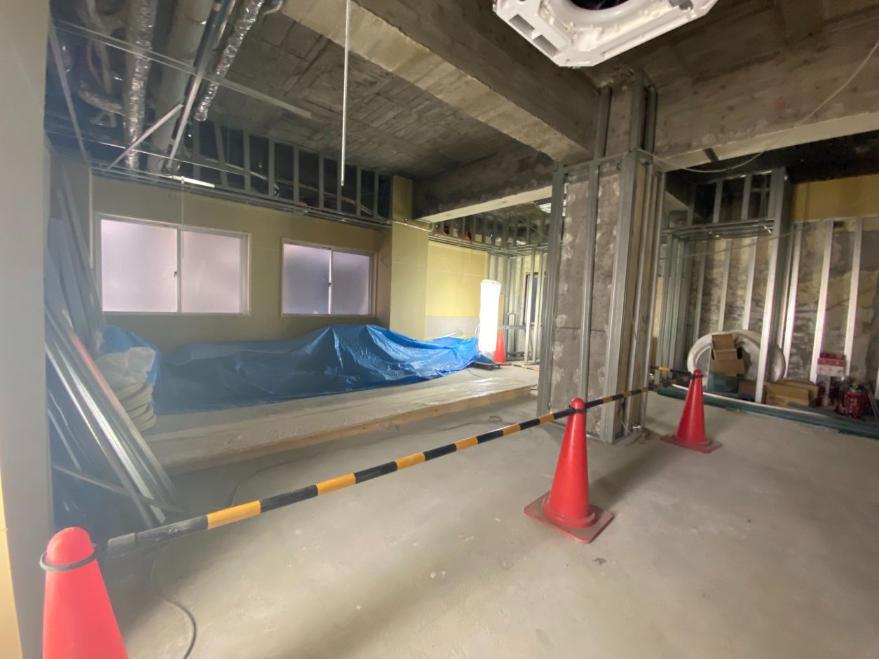 工事中のラウンジ入り口付近。実は元々壁が無く、エントランスから丸見えの状態でした。