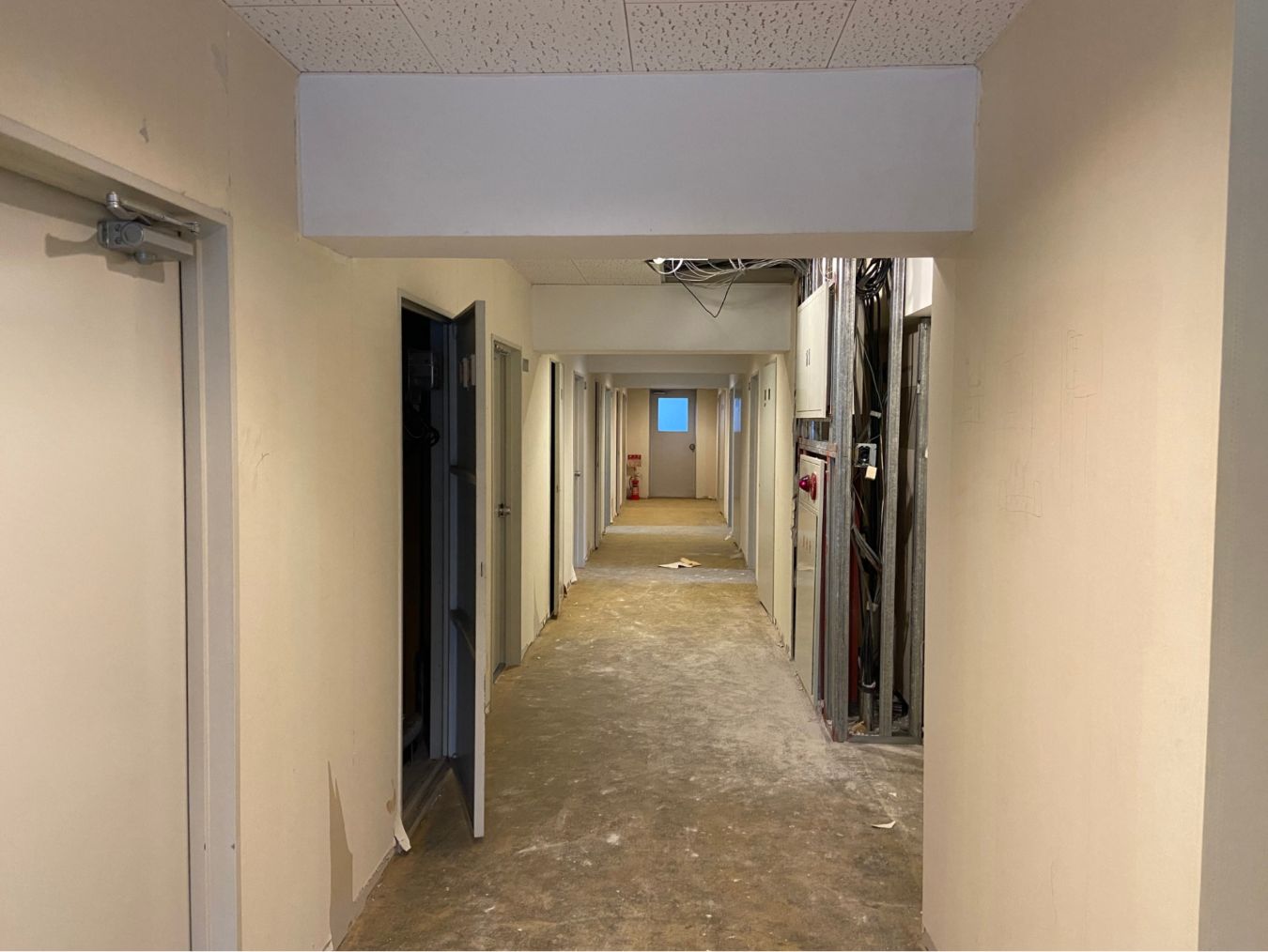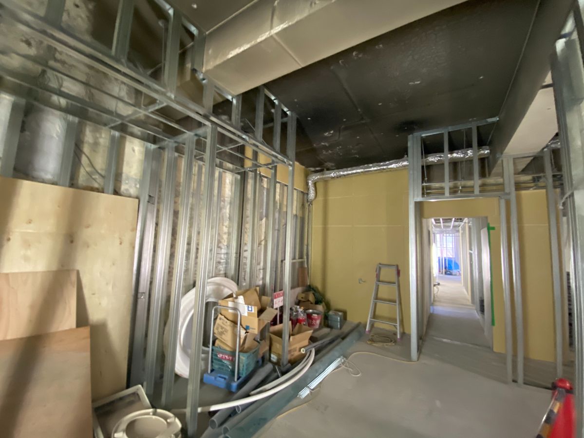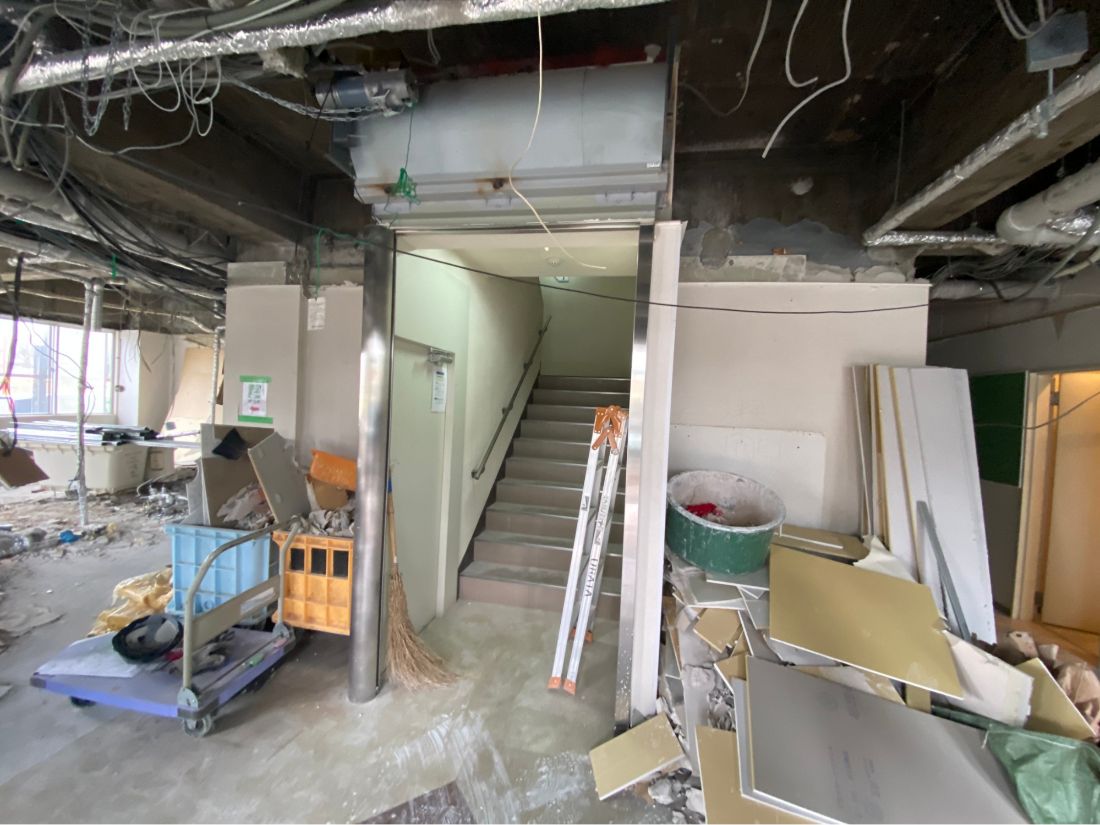 さらに奥に進むと、居室に続く階段が現れます。左は工事中のラウンジ、右にはエレベーターがあります。