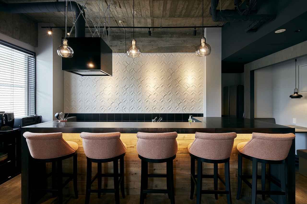 印象的なデザインのタイルが目を引きます。こちらには皆と話しながら料理が出来るカウンターキッチンが完成。コミュニティの中心になるのではないでしょうか。
