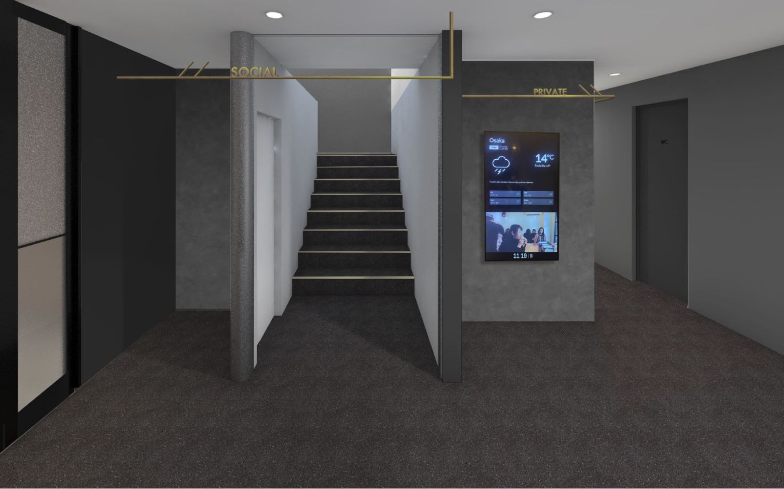 今回の物件テーマは「時を纏う」。ワーキングラウンジでは時間とともに移り変わっていく照明が空間のポイントになっており、事前の内覧会ではこちらのイメージパースをご覧いただいておりました。