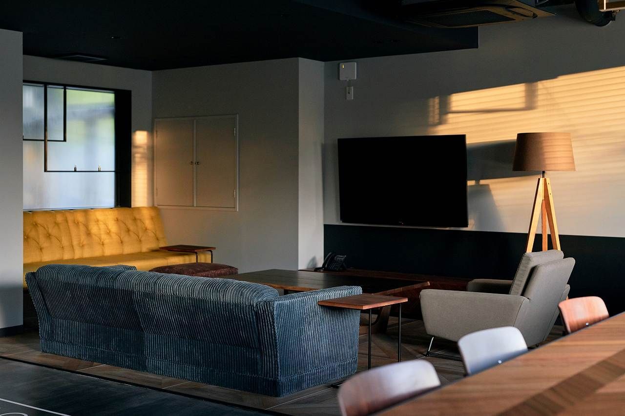 次は、京都移住を決めたリモートワーカーの皆様にも評判のいいワーキングラウンジ。もとは食堂として利用されていた広い空間を仕切り直して作っています。