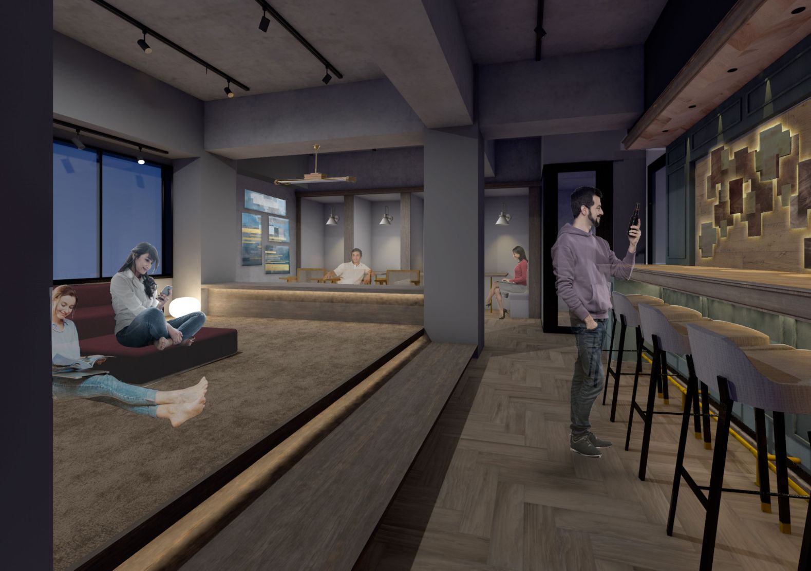 なんということでしょう。カウンター席に加え、寝ころびたくなるような小上がりスペース、さらに集中できそうなブース席まで設置され、どれもイメージパースどおりの仕上がり…!