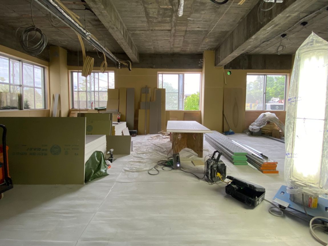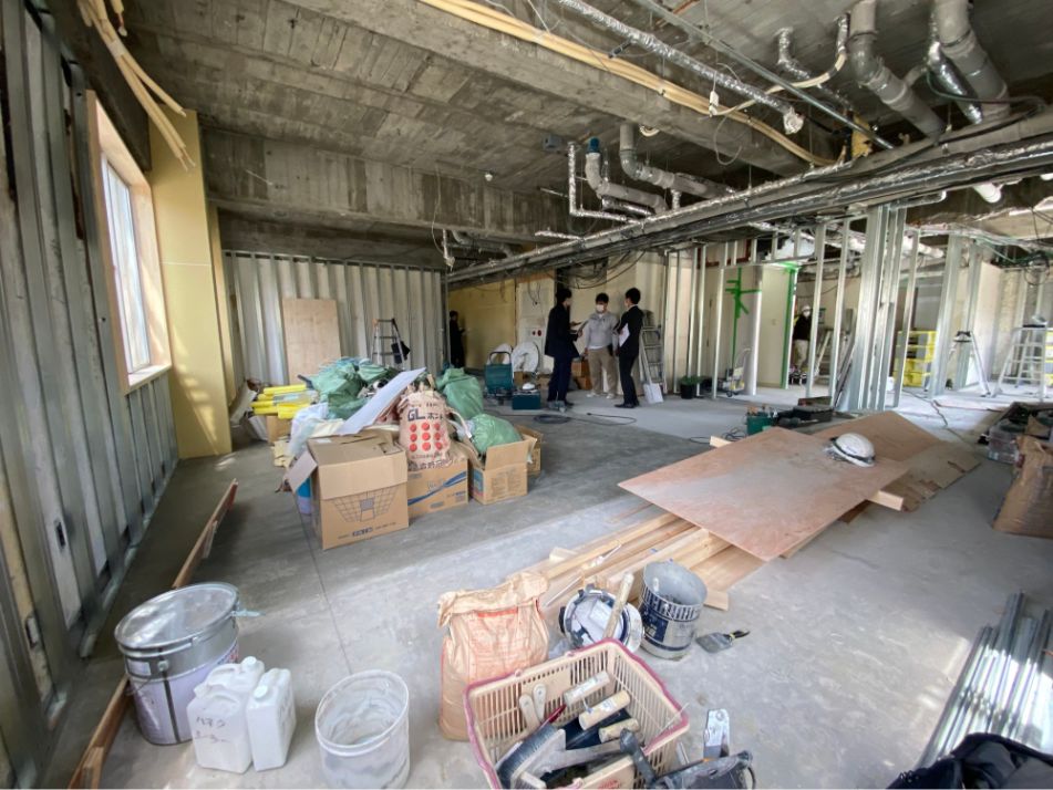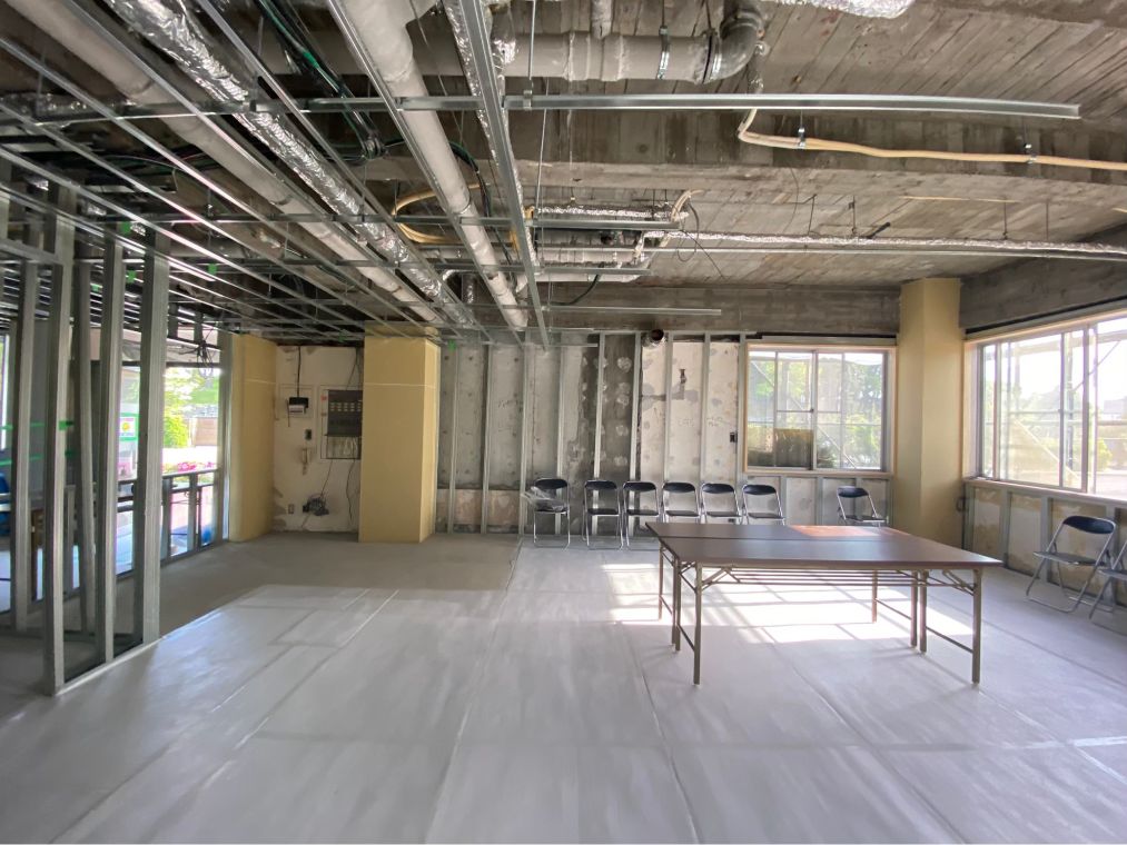 メインの交流スペースとなっていくラウンジ空間。解体工事中は資材だらけの空間でした。