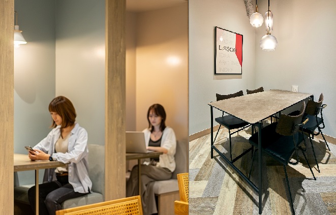 ブース席にはもちろんコンセントも完備。WEB会議やちょっとしたミーティングにもぴったりなフォンブースもうれしい設備です。