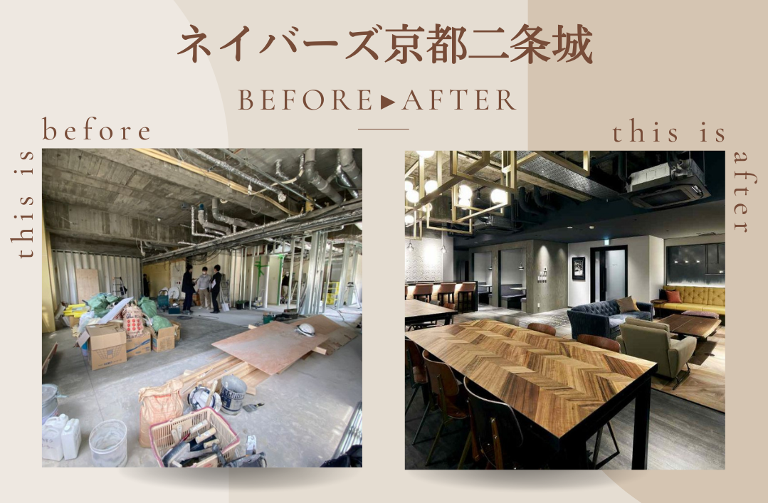 今回は営業担当の笹木から、工事中と完成後の写真を比較してご紹介致します。「ネイバーズ京都二条城」の劇的なビフォーアフターをお楽しみください!