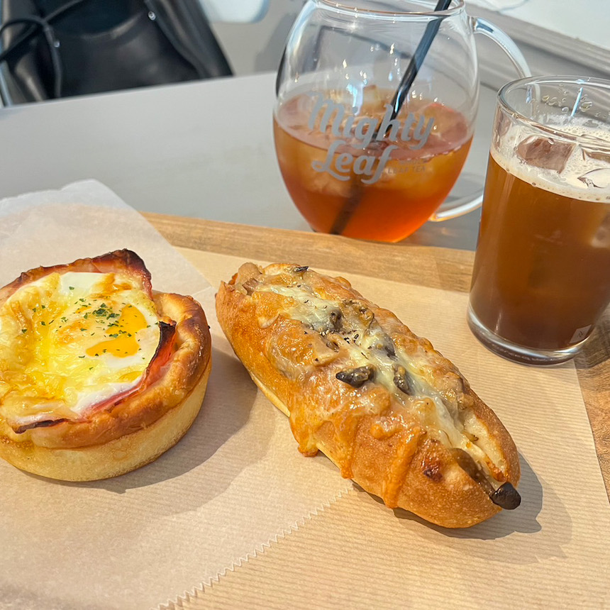 朝から何も食べていない二人は、「キノコとチキンのホットサンド」「ベーコンエッグ」を注文していました。焼きたてのパンは匂いからも食欲をそそられます。