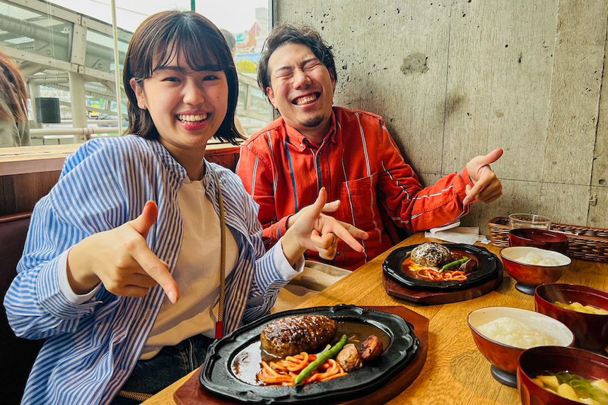 二人が注文したのは「君のハンバーグ」「柚子おろしハンバーグ」ハンバーグを目の前にこの笑顔です。