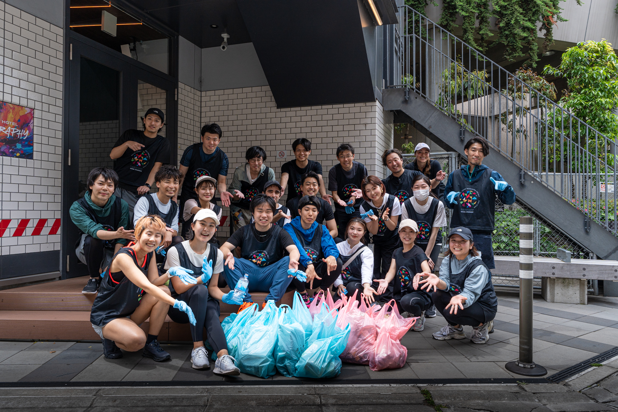 当日は、ソーシャルアパートメントの入居者を中心に、HOTEL GRAPHY渋谷のゲストを交えた30名弱のメンバーが、2つのコースに分かれて渋谷〜恵比寿〜代官山エリアの約3〜4kmの距離を、ジョギングしながらゴミ拾いしました。