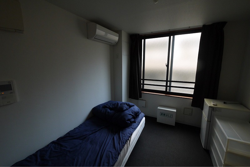 ▲(Before)8㎡のコンパクトな居室。冷蔵庫や収納ボックスなどを置いてしまうと、家具だけでいっぱいに。