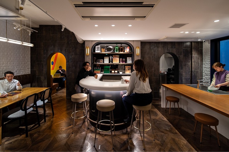 ▲(After)ラウンジスペースの中央にバーカウンターを設置。ラウンジにふらっと来たらバーカウンターで立ち話、なんてことも。中央のバーカウンター、左側ダイニングテーブル、左奥のボックスシートと空間を分けることで、コンパクトながらもそれぞれの滞在場所を確保できる空間にしました。