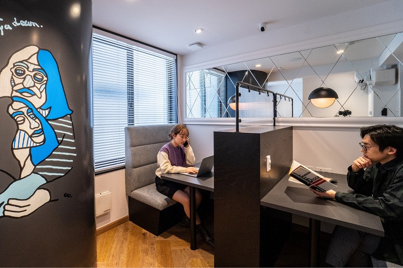 ▲(After)第3のラウンジとして、ワーキングスペースに変わりました。コンパクトな空間なものの、ボックス席を3席と限定することで、それぞれに広い作業スペースを確保。さらに無音空間が苦手、という方も多いのでiPod touchとスピーカーが用意されていて、自分の好きな音楽をBGMとして流せるようになっています。さらに在宅ワークのニーズにも応えられるよう、完全個室ワークスペースも設置しました。周囲の音を気にせず、Webミーティングや電話などができるようになっています。