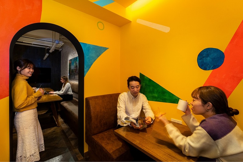 ▲(After)入口の両側にボックスシートを設置することで、2人で会話できるスペースを両側に設けました。さらに空間が広く感じるよう、壁全面に明るいアートを施しています。